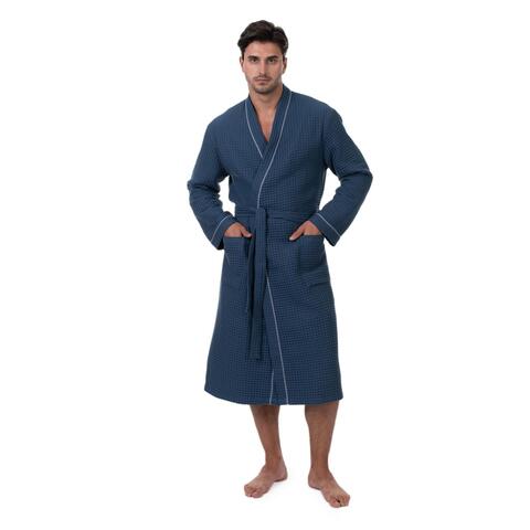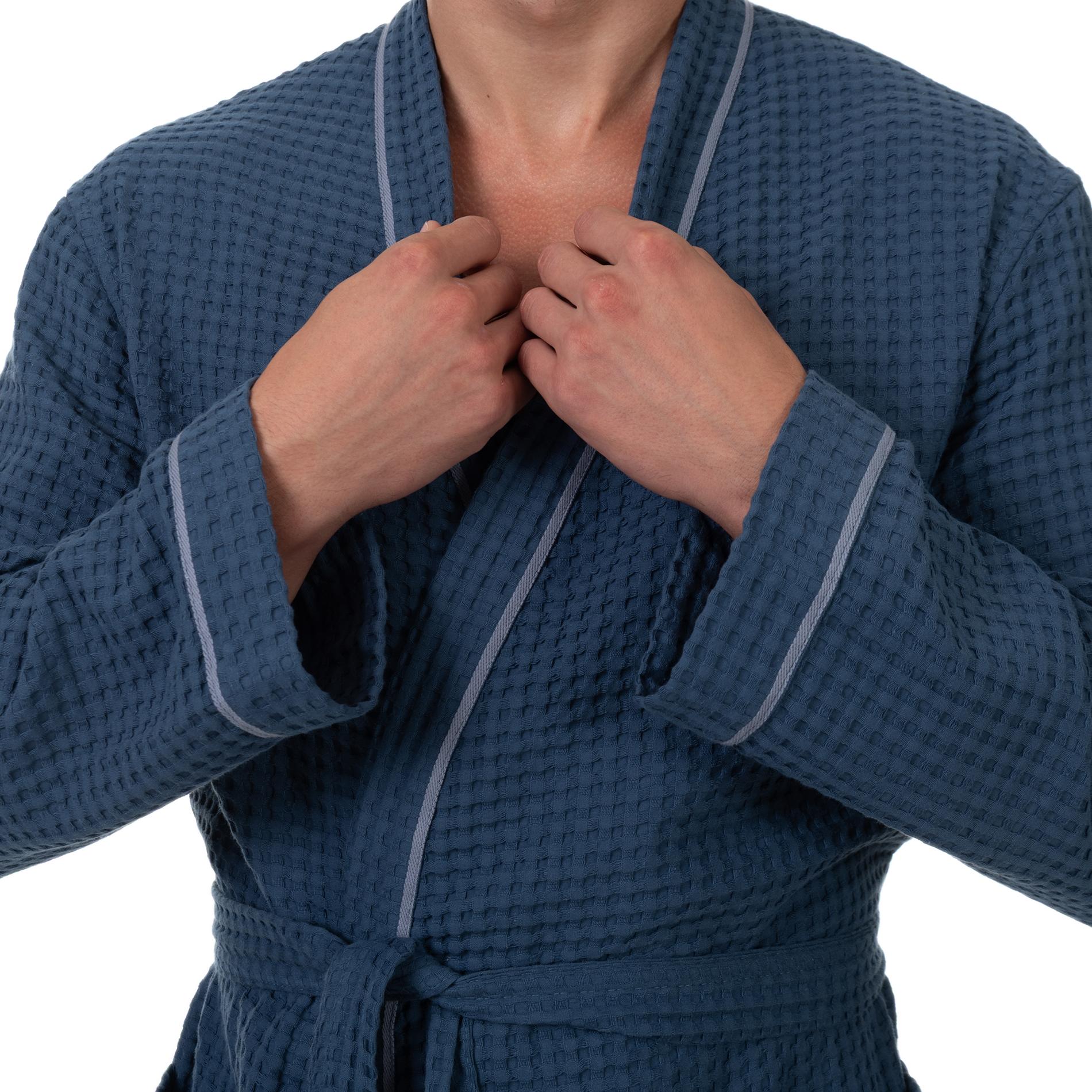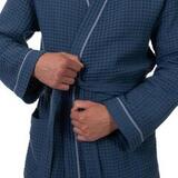 Мужской рельефный одноцветный халат Avignone – это новые тактильные ощущения и абсолютный комфорт. Ткань с объемным переплетением имеет особую рельефную фактуру, которая напоминает вафельную, но при этом она более мягкая, пластичная и приятная на ощупь. Изделие в бархатно-синем исполнении украшено отделочной планкой и манжетами в лилово-сером оттенке. Халат длиной 15 см ниже колен с удлиненной линией плеча и рукавами рубашечного кроя оформлен воротником-планкой, поясом и накладными карманами. Модель очень легкая, при этом она прекрасно впитывает влагу и пропускает воздух. В таком халате комфортно в любое время года, поскольку он выполнен из дышащей, полностью натуральной ткани. Его можно носить дома, а также удобно брать с собой в бассейн, сауну и в путешествие.